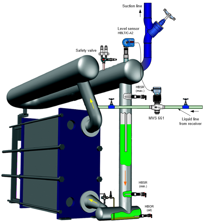 HBLT-A2 capacitive liquid level transmitters are used to measure liquid levels in refrigerant vessels. The sensor transmits a current signal from 4 to 20 mA (4 mA when the transmitter does not register liquid - and 20 mA when the entire transmitter is surrounded by liquid).