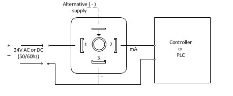 4 mA when the transmitter does not register liquid and 20 mA when the entire transmitter is surrounded by liquid .The 4-20 mA signal from HBLT can be used in conjunction with a controller e.g HBLT-C1 to control the liquid level.