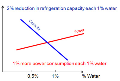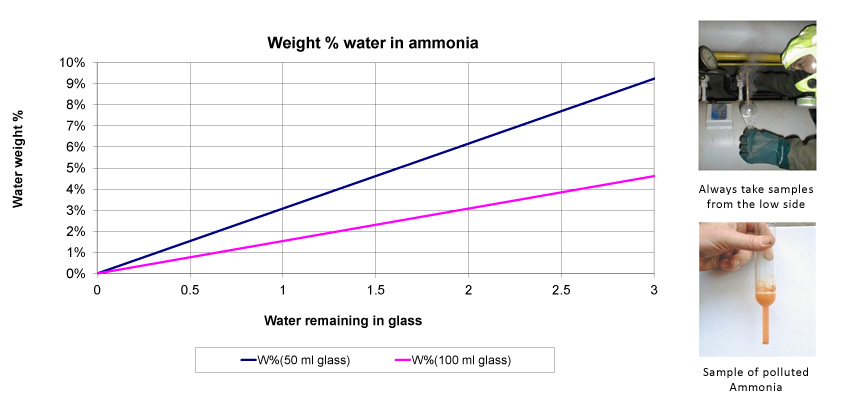 Measuring water in Ammonia is easy for any trained technician to do, you can simply drain off 100mL of Ammonia from the low side, and leave it in an safe, open place to evaporate – then measure the remaining water content. Alternatively if a recirculated evaporator is operating a few degrees higher than what it’s pressure gauge indicates, this is also a sign of a water contaminated system!